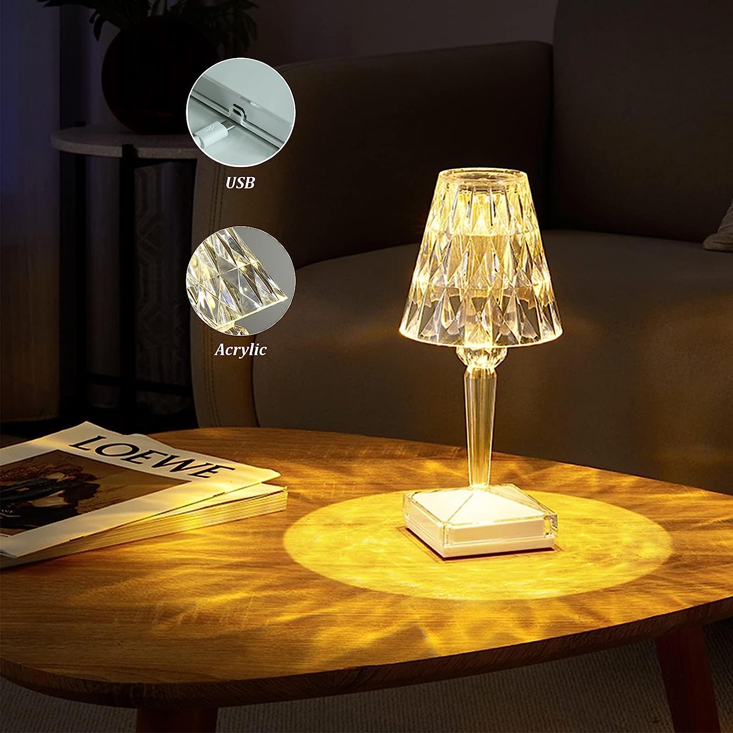 USB Rechargeable Crystal Diamond Table Lamps- Acrylic crystal table lamps come with a USB charging cable, built-in 800 mAh battery, no need to plug in when using. Crystal table lamp can be used for 6-7 hours after being fully charged,the light used high quality LED chip, soft, warm light and no flicking